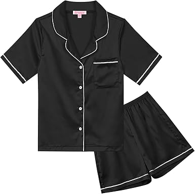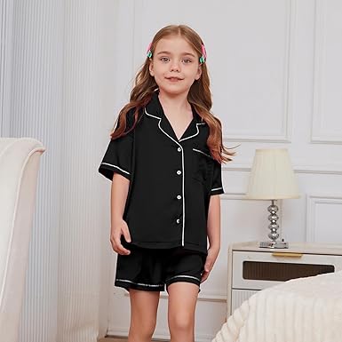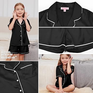 - Pajamas style: girls/Boys silk pajamas set, soft and silky short sleeve tops, Single-breasted closure, one front pocket and stylish turn-down collar. Suitable for boys and girls wear in spring and summer.