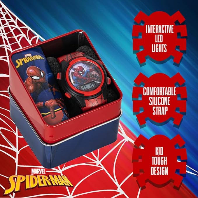 - Interactive LED Lights: This Spiderman kids digital watch features exciting interactive LED lights that make time-telling fun and engaging for young superheroes. Perfect for playtime and special occasions.